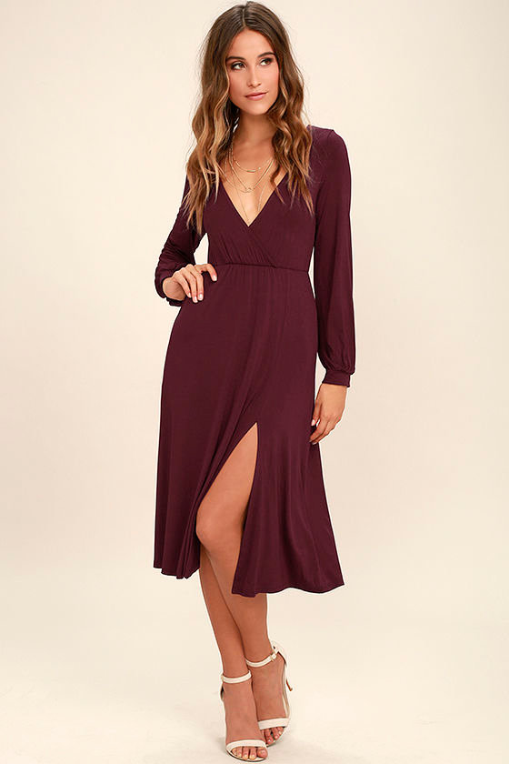 Vintage Burgundy Lace Round Neck Long Sleeve Pleated Midi ...