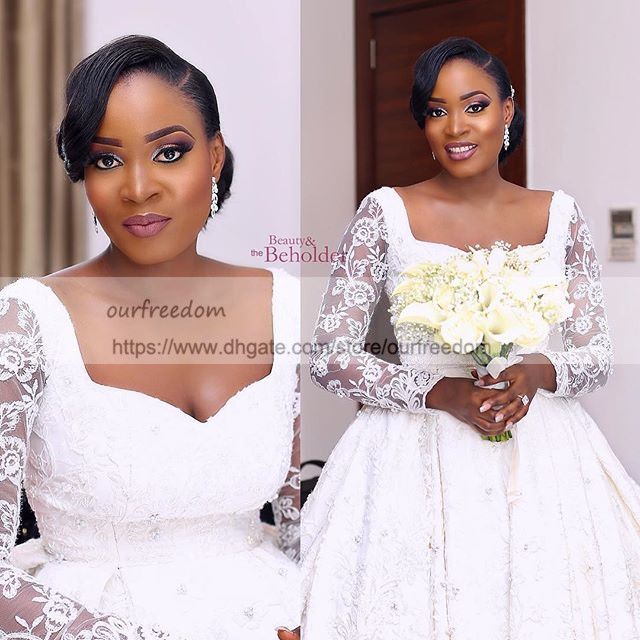 Long Sleeve Square Neck Bridal Gowns. Looking for high neck wedding dresses to create an elegant look on your big day? Low v back chapel train classy lace mermaid bridal gown. Pretty allencon lace on the bodice and sleeves.